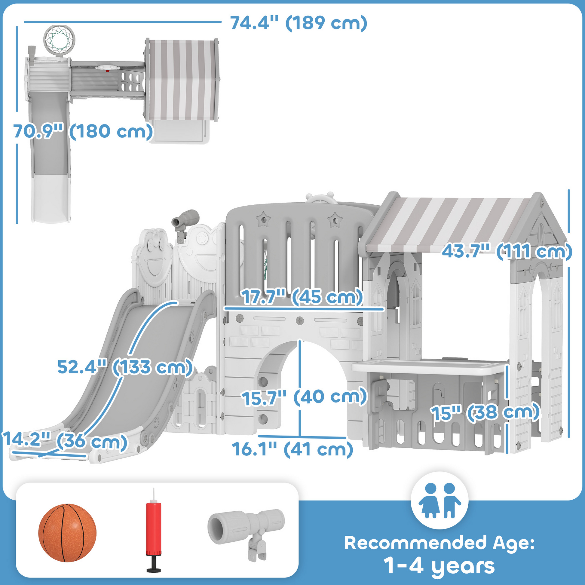Qaba 7-in-1 Toddler Slide, Kids Slide Climber Playset with Playhouse and Basketball Hoop for 1-4 Years, Grey